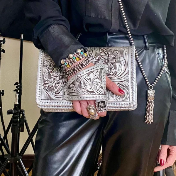 The intricate floral carvings aren't just printed on—they're sculpted into the surface, creating layers of depth you can actually feel. When light hits the raised petals and leaves, it casts beautiful shadows that shift as you move, giving this clutch a living, artistic quality that flat designs simply can't match.