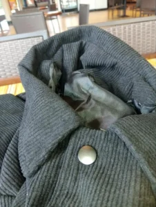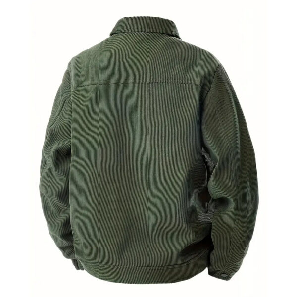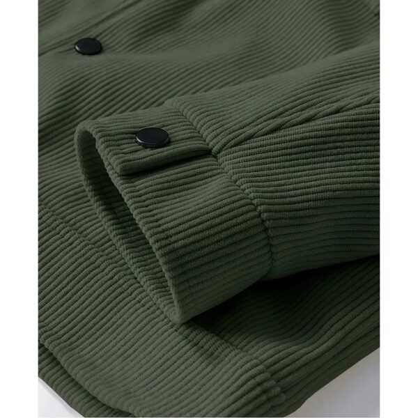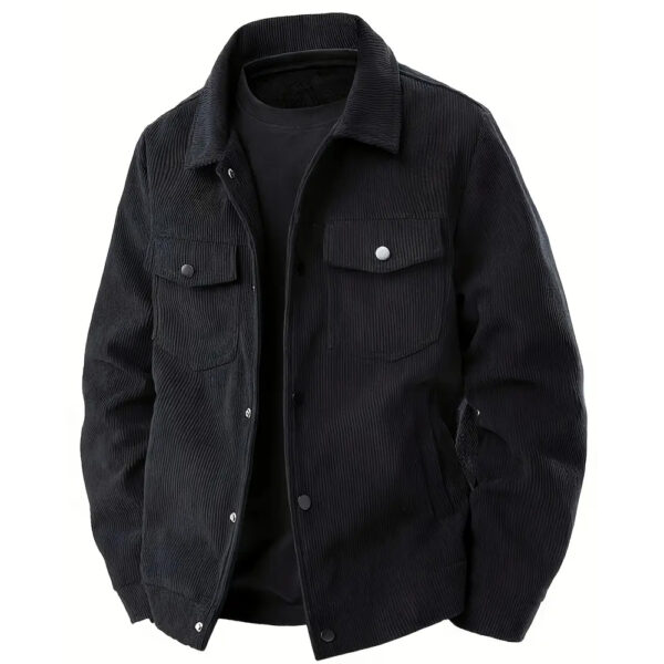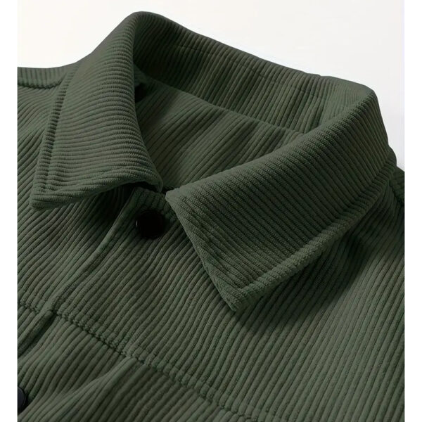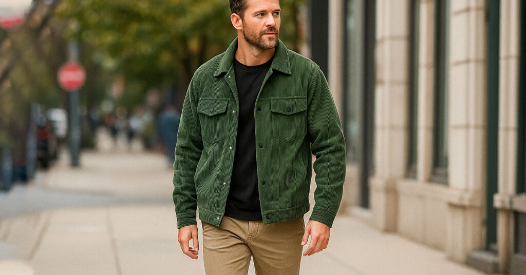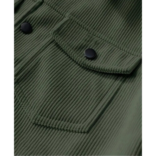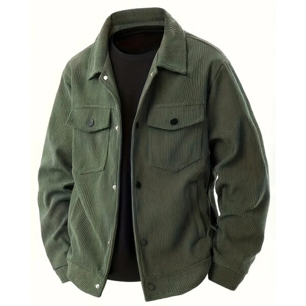 Corduroy isn't waterproof, but it handles light drizzle reasonably well. For heavy rain, you'll want a proper rain jacket over it or underneath. The fabric dries relatively quickly after getting damp.